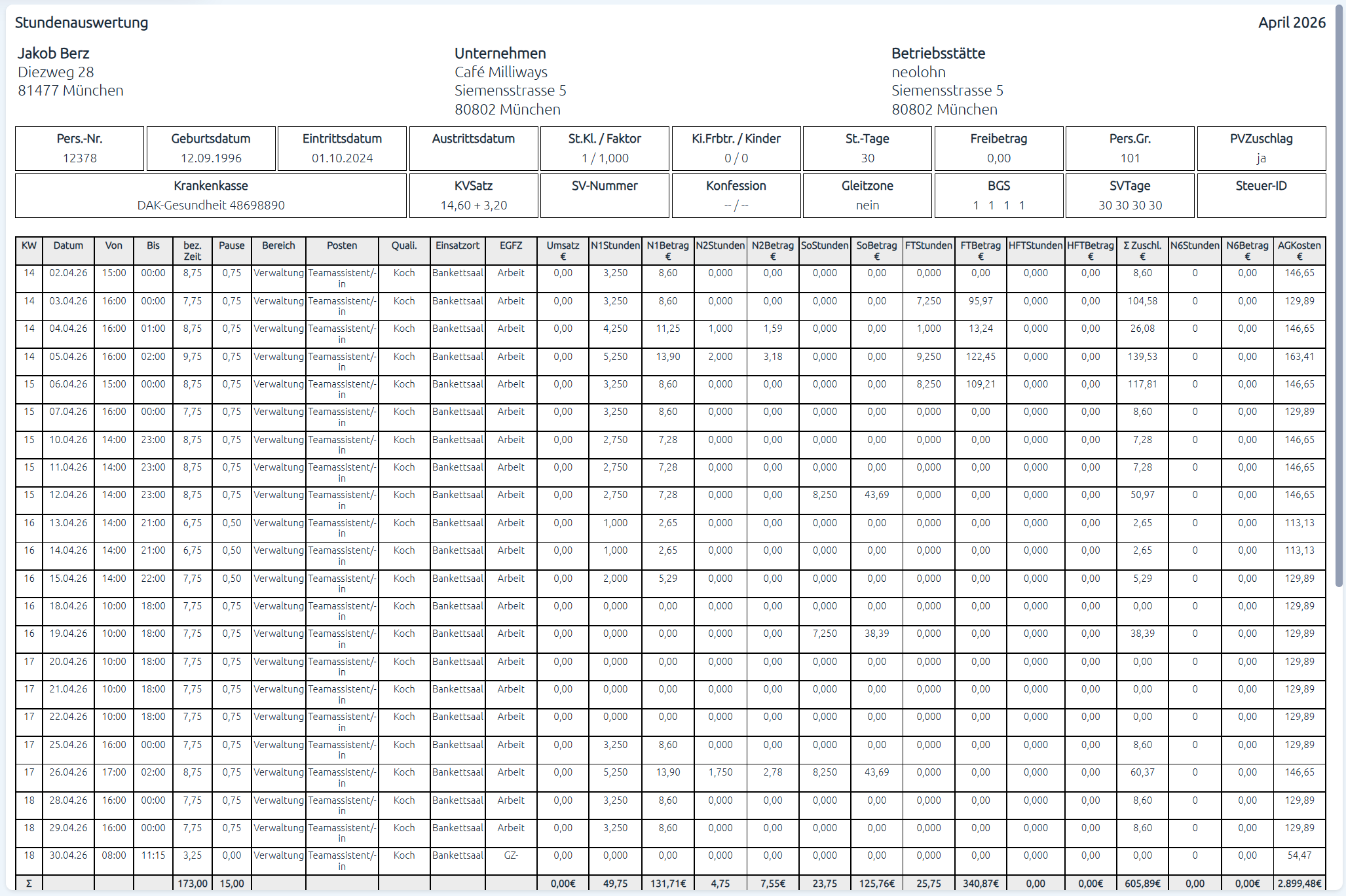 In Neolohn stehen dennoch detaillierte Auswertungen zur Verfügung, wie z. B. die Stundenauswertung, in der genau ersichtlich ist, wann welche Zuschläge berechnet wurden.